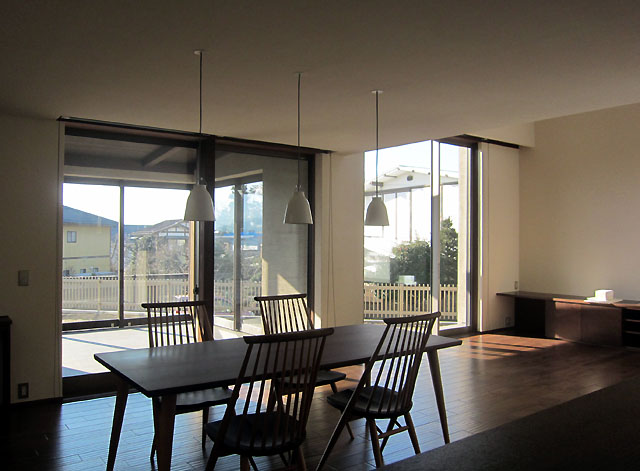 12月17日(土)の朝竣工引渡しになり、その週末を利用して新居へのお引越しをしていただきました。設計の初期の段階で重要視した点は、敷地と道路にある高低差の有効利用、土地形状の特性を活かした配置計画、明快なゾーニングと合理的な動線計画、北側の歩道にある桜並木を室内の随所から見えるようにしたい、2階から南方向に見える松本市街の眺望を活かしたい、そして長期優良住宅の認定を受ける、というようなことでした。
